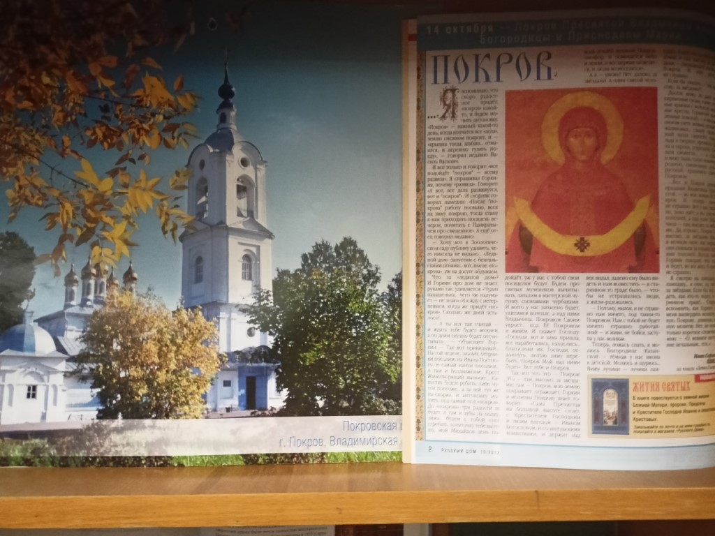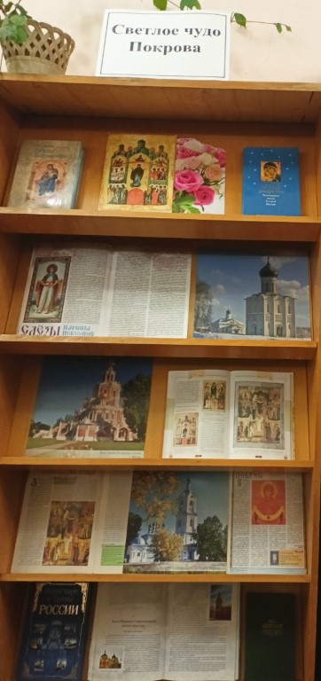 Православная церковь 14 октября отмечает великий для верующих праздник – Покров Пресвятой Богородицы. В Центральной городской библиотеке имени Л. Н. Никоновой оформлена книжно-иллюстративная выставка «Светлое чудо Покрова».