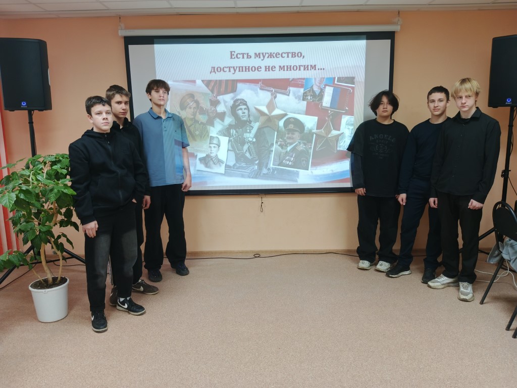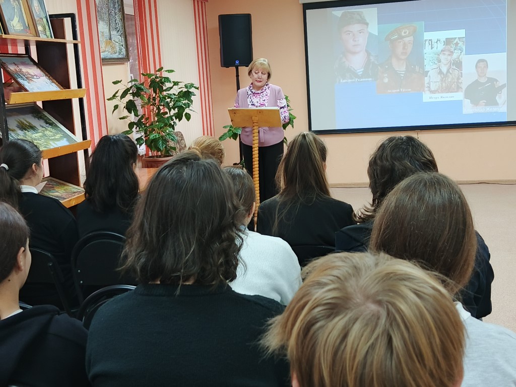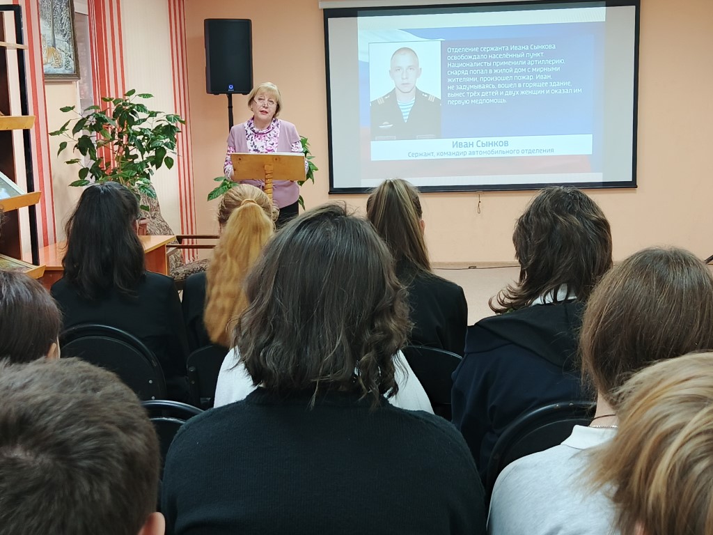 17 октября в библиотеке-филиале № 2 микрорайона Северо-Задонск для учащихся 8-го класса центра образования № 4 прошли громкие чтения «Есть мужество, доступное немногим». Ребятам были зачитаны отрывки из книги И. Шкадаревича «Бессмертный подвиг Александра Матросова», статья из журнала «Воин России» – о подвиге Евгения Родионова во время Чеченской войны, а также заметки из газет о героическом поступке Василия Щербакова в годы Афганской войны и о герое-участнике СВО – Иване Сынкове.