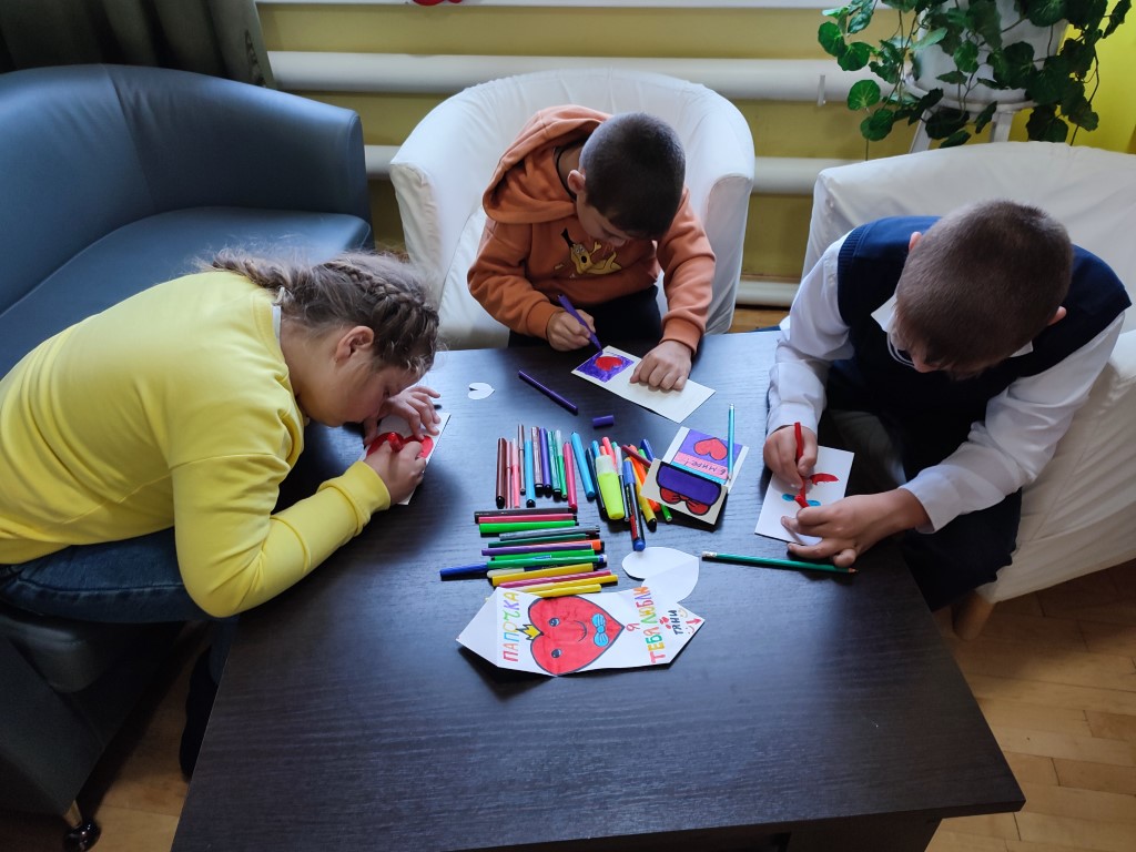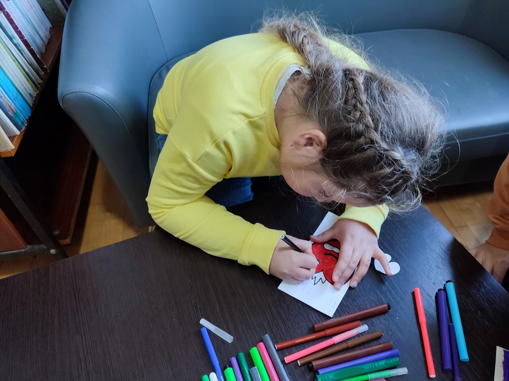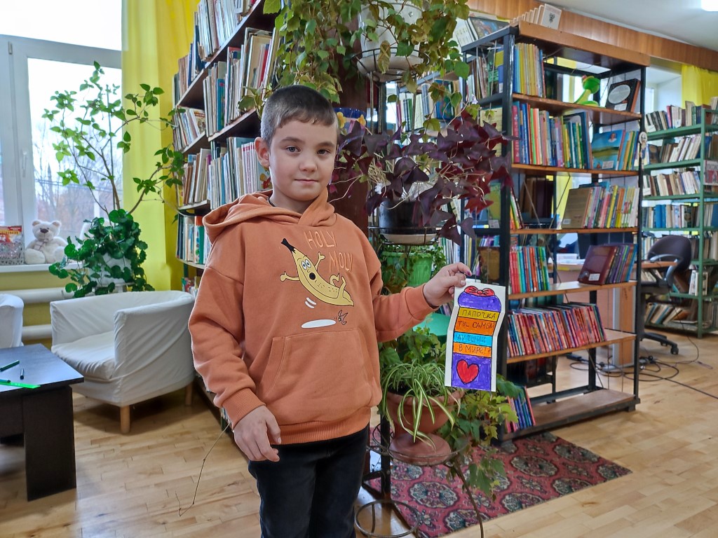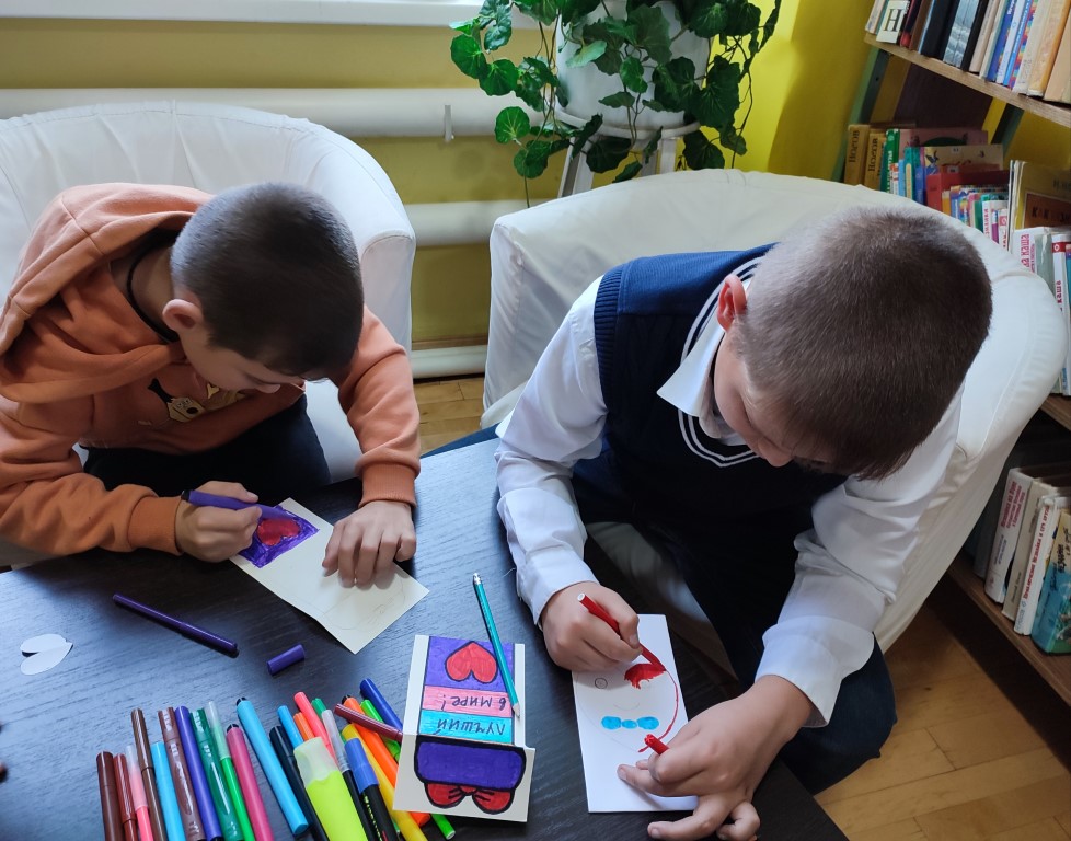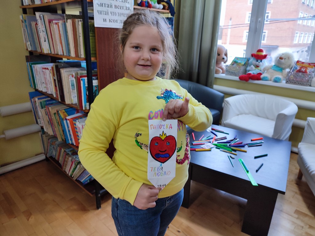 С самого утра юные посетители библиотеки, вооружившись цветной бумагой, ножницами, клеем и фломастерами, принялись создавать уникальные поздравления для своих дорогих пап.