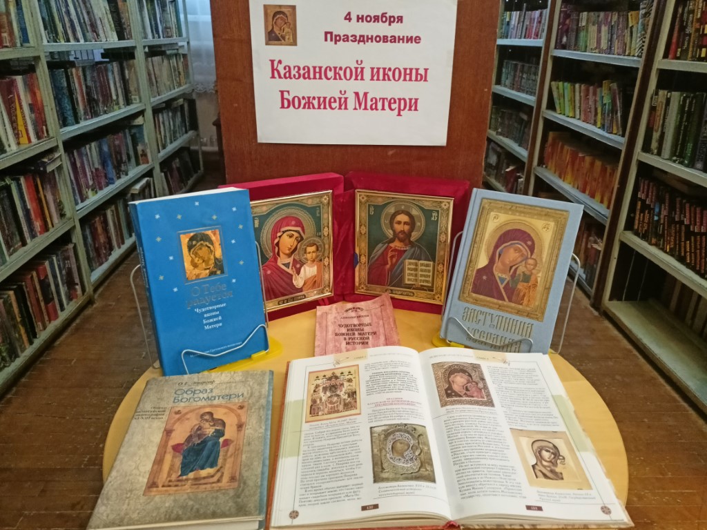 В Центральной городской библиотеке имени Л. Н. Никоновой оформлена выставочная экспозиция, на которой можно познакомиться с книгами, рассказывающими об образе Казанской Божией Матери, а также о чудотворениях, проистекающих от иконы.