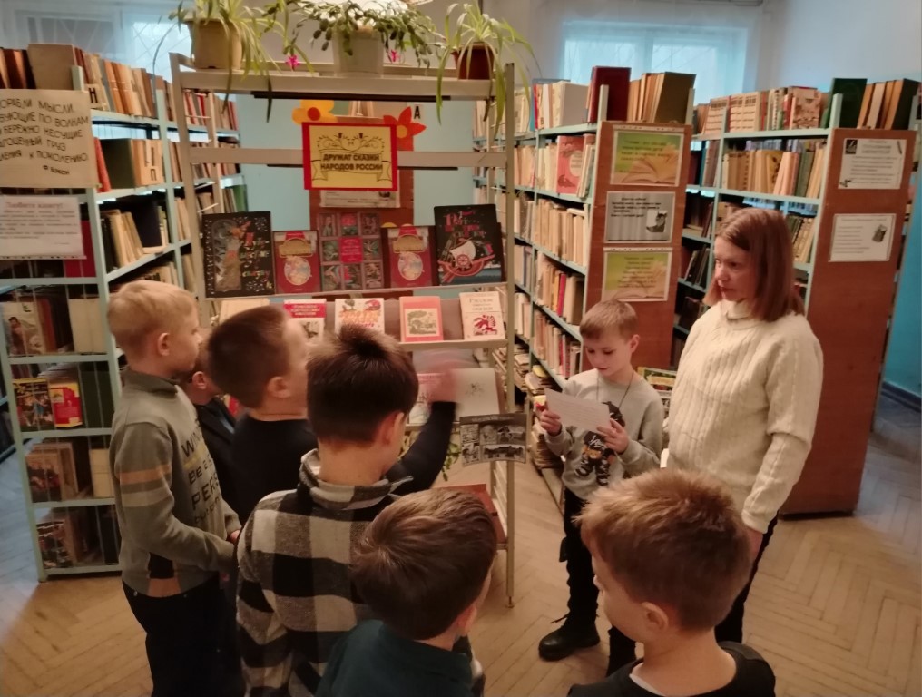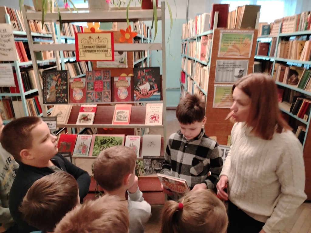 Гостей встретила библиотекарь с рассказом о том, что кроме русских в России проживают и другие народы, которые имеют свои национальные сказки.