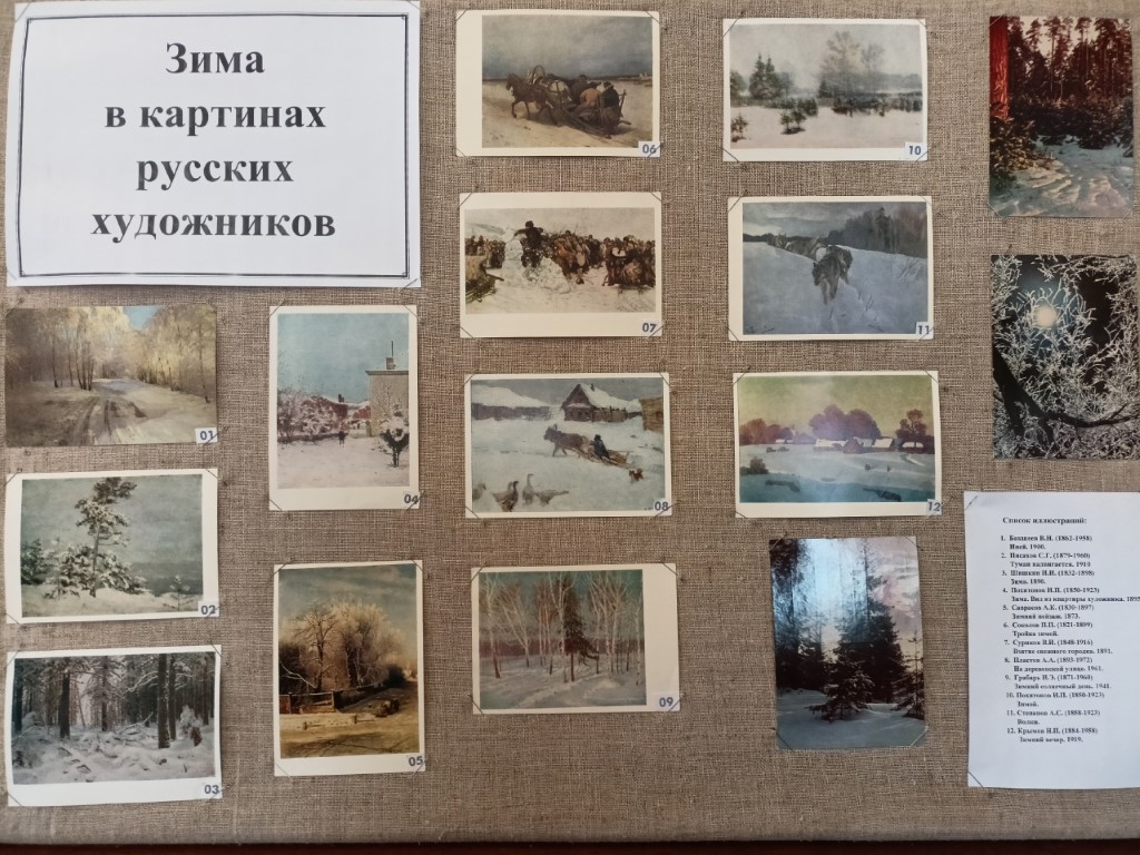 В Центральной городской библиотеке имени Л. Н. Никоновой открылась выставка «Зима в картинах русских художников», посвящённая русским художникам-пейзажистам, которые смогли запечатлеть на полотнах великолепие русской зимы. Экспозиция привлекает внимание изысканностью и красотой. Представлены открытки 50–60-х годов прошлого века с изображением шедевров таких мастеров, как Иван Шишкин, Василий Суриков, Алексей Саврасов и многих других.