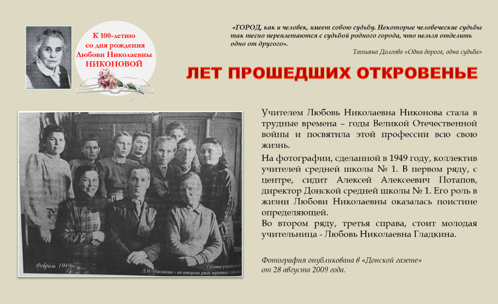 Шаг за шагом, год за годом, десятилетие за десятилетием возрождался, отстраивался наш город, шёл к своему нынешнему облику. От печи и примуса – к голубому огоньку природного газа в каждом доме. От оцинкованного корыта – к стиральной машине-автомату. От дежурной продуктовой палатки – к широкой сети магазинов, в которых есть всё, что только пожелаешь. От самодельных деревянных счётных палочек первоклассника – к современным компьютерам. И каждый шаг, каждый этап – это люди, дончане разных поколений. Сколько их прошло через руки педагога Любови Николаевны Никоновой! Скольким своим ученикам дала напутствие, провожая их с порога школы в самостоятельную жизнь! Да и сейчас – сколько людей в трудную минуту обращаются к ней, к представителю женсовета, веря в её мудрость и доброту! И она, преодолевая непременные недуги преклонных лет, спешит на помощь. Потому что не привыкла стоять «с краю». Потому что не может и не хочет жить иначе. Потому что, связав когда-то свою судьбу с городом, ставшим родным, хочет быть нужной ему до конца.