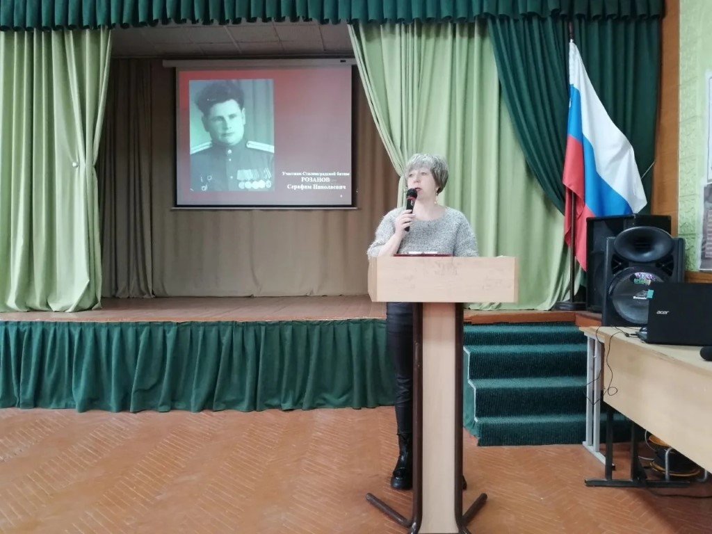 Далее библиотекари познакомили учащихся с героической биографией дончан – участников Сталинградской битвы – Анны Алексеевны и Серафима Николаевича Розановых.