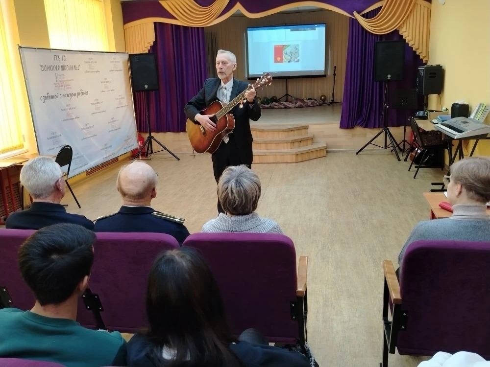 Далее Валерий Владимирович Богров, майор запаса, рассказал про своего одноклассника, участника Афганской войны Владимира Потапова, а также о своей службе в рядах ВДВ. А затем, взял в руки гитару и исполнил всем известные песни, которые подпевал весь зал.