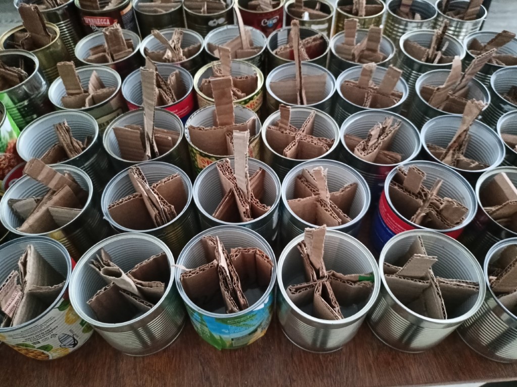 Для её изготовления нужен гофрированный картон, например, от бытовой или кухонной техники, жестяная банка от консервированного горошка или кукурузы и парафин.