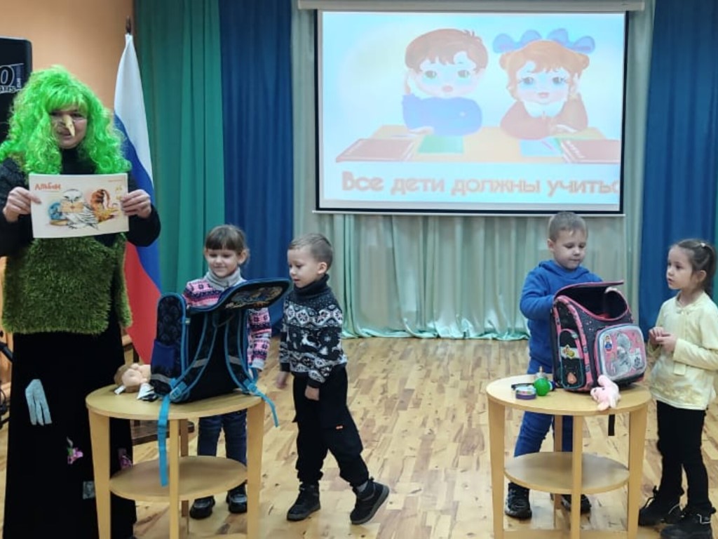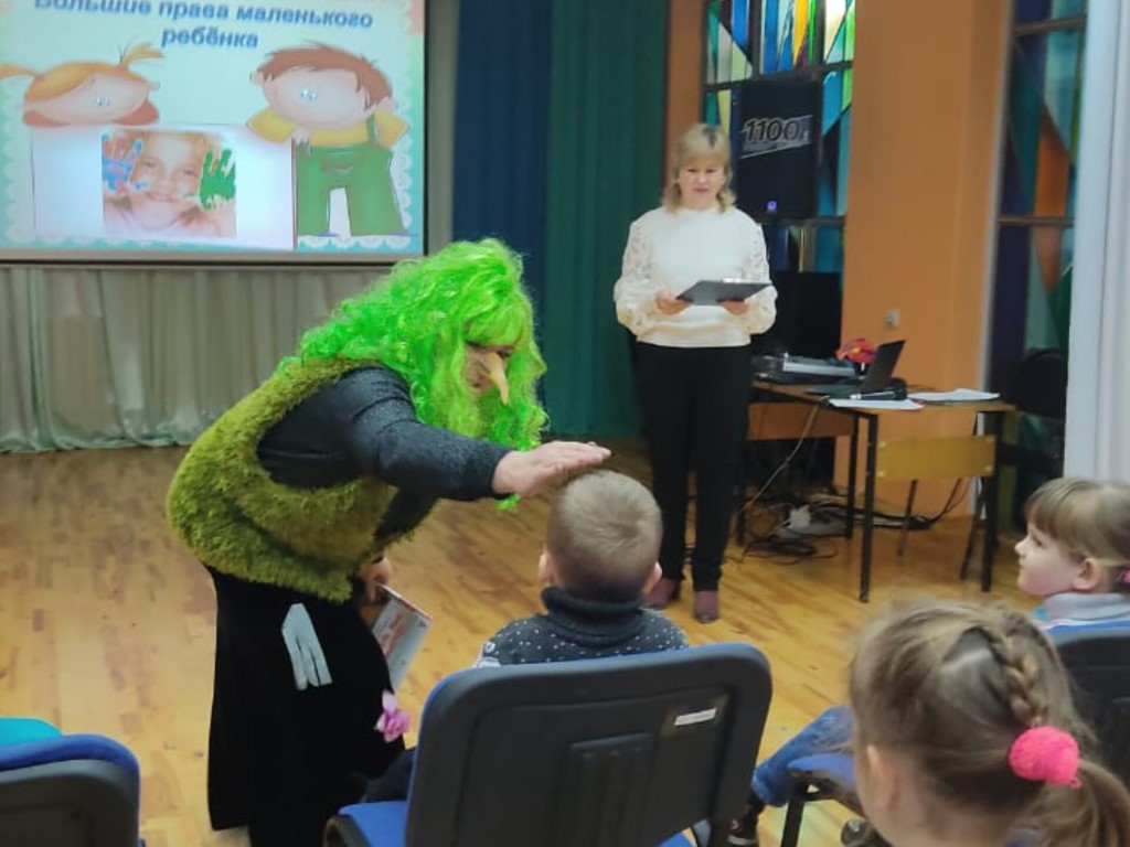 Мероприятие шло своим чередом, но внезапно, словно из густого леса, в библиотеку ворвалась… Кикимора! Зелёная, лохматая и, как оказалось, невероятно коварная. Никто не успел опомниться, как она схватила самое ценное – Декларацию прав ребёнка. Кикимора выдвинула условие, что отдаст книгу, но только после того, как дети пройдут все её испытания. Немного застенчиво, но с большим энтузиазмом, ребята справились со всеми заданиями. Кикимора не только вернула книгу, но и пообещала больше никогда не нарушать права детей.