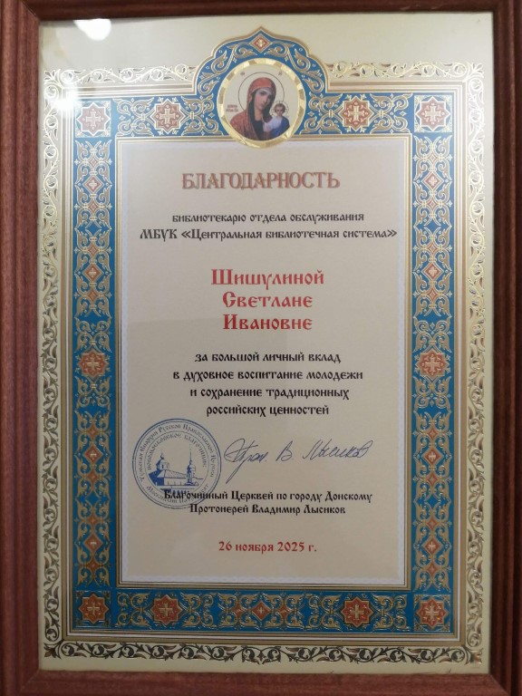 26 ноября библиотекарь отдела обслуживания Центральной городской библиотеки имени Л. Н. Никоновой Светлана Шишулина приняла участие в XX Рождественских образовательных чтениях муниципального образования город Донской «Просвещение и нравственность: формирование личности и вызовы времени». Ею было подготовлено выступление на тему: «Взаимодействие Русской православной церкви и системы образования России».