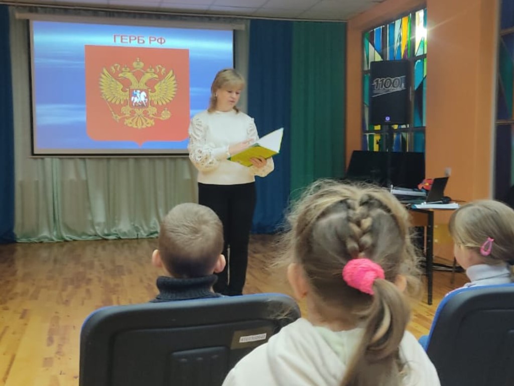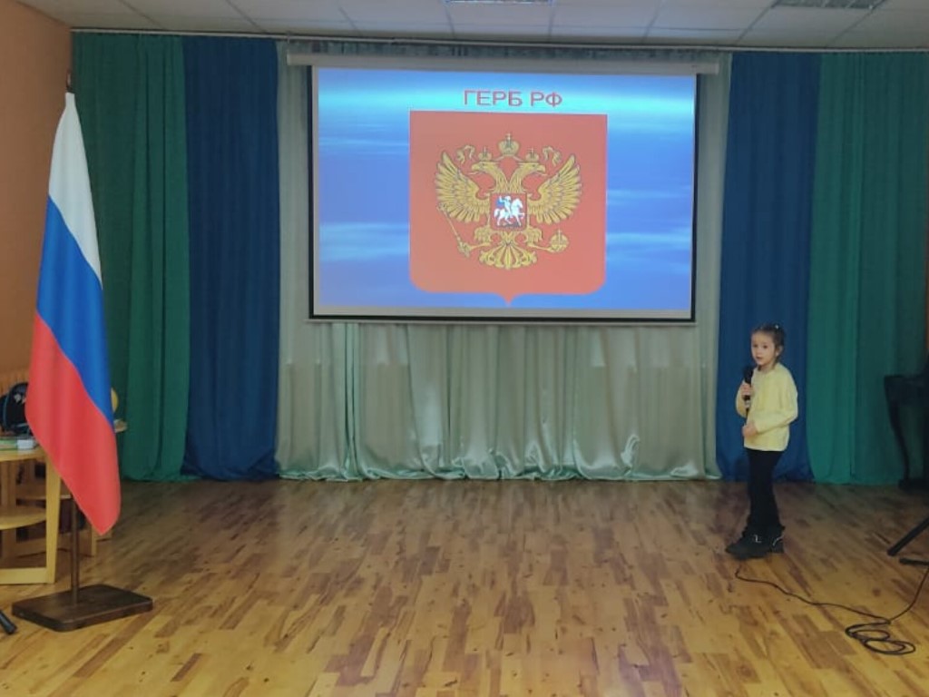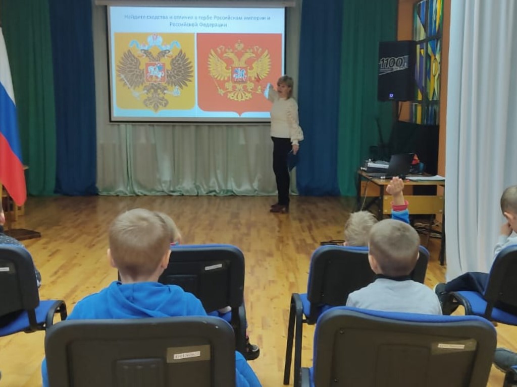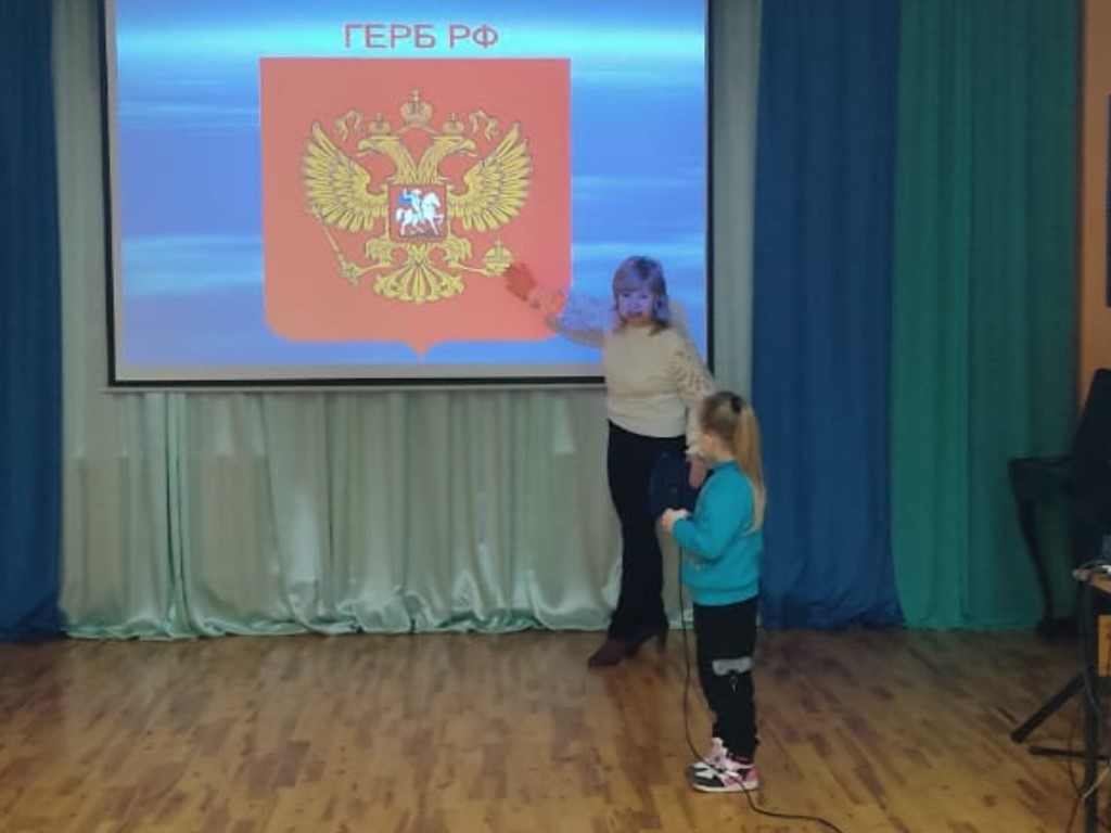 Ведущая начала мероприятие с рассказа об истории герба, о значении каждого элемента – двуглавом орле, символизирующем мощь и единство; скипетре и державе, олицетворяющих государственность; о геральдических цветах, несущих глубокий смысл.