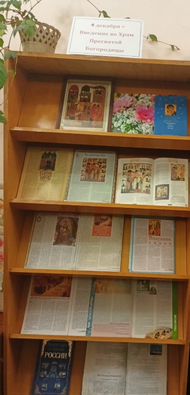 4 декабря в Центральной городской библиотеке имени Л. Н. Никоновой вниманию пользователей представлена выставочная экспозиция «Введение во храм Пресвятой Богородицы».