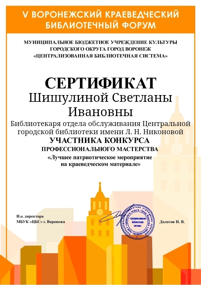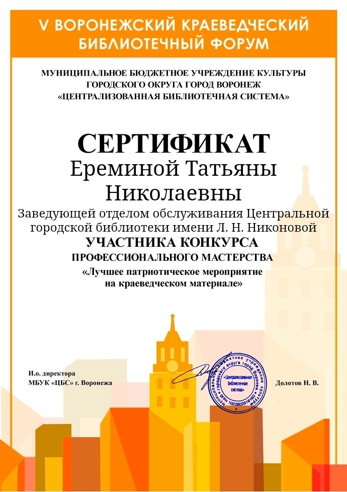 Центральная городская библиотека имени Л. Н. Никоновой приняла участие во Всероссийском библиотечном конкурсе «Лучшее патриотическое мероприятие на краеведческом материале», который прошёл в рамках V Воронежского краеведческого форума.
