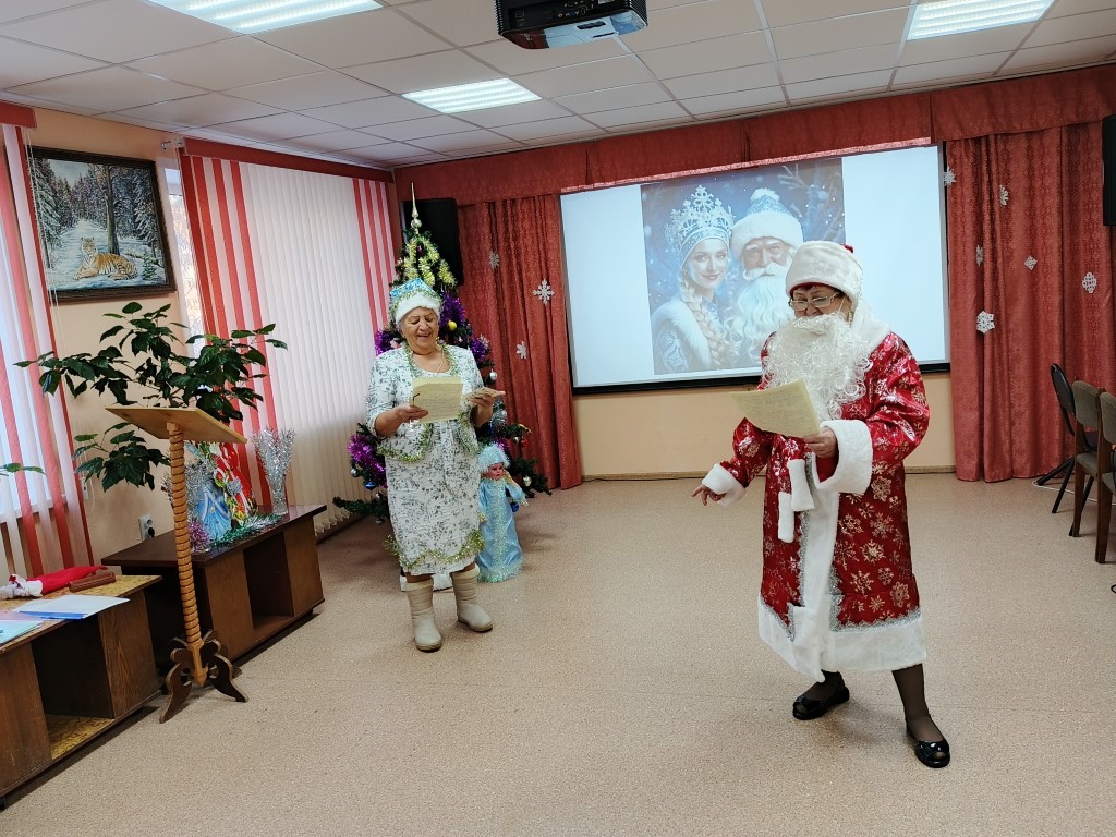 На вечер пожаловали Дед Мороз и Снегурочка, принеся с собой атмосферу сказки и веселья. Гостей ждала развлекательная программа с новогодними играми и конкурсами. Нарядная ёлка, накрытые для чаепития столы, зимние мелодии – всё это создало ощущение доброго праздника.