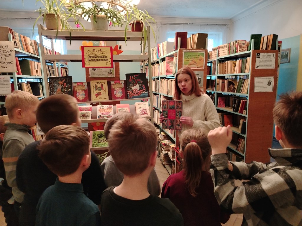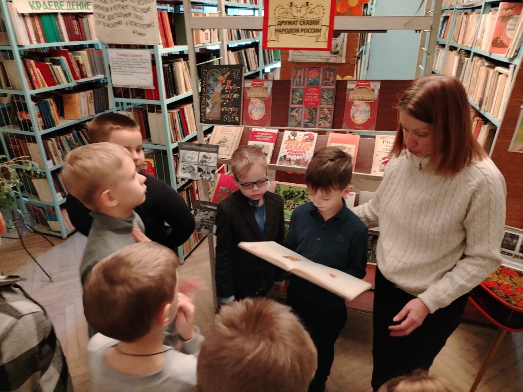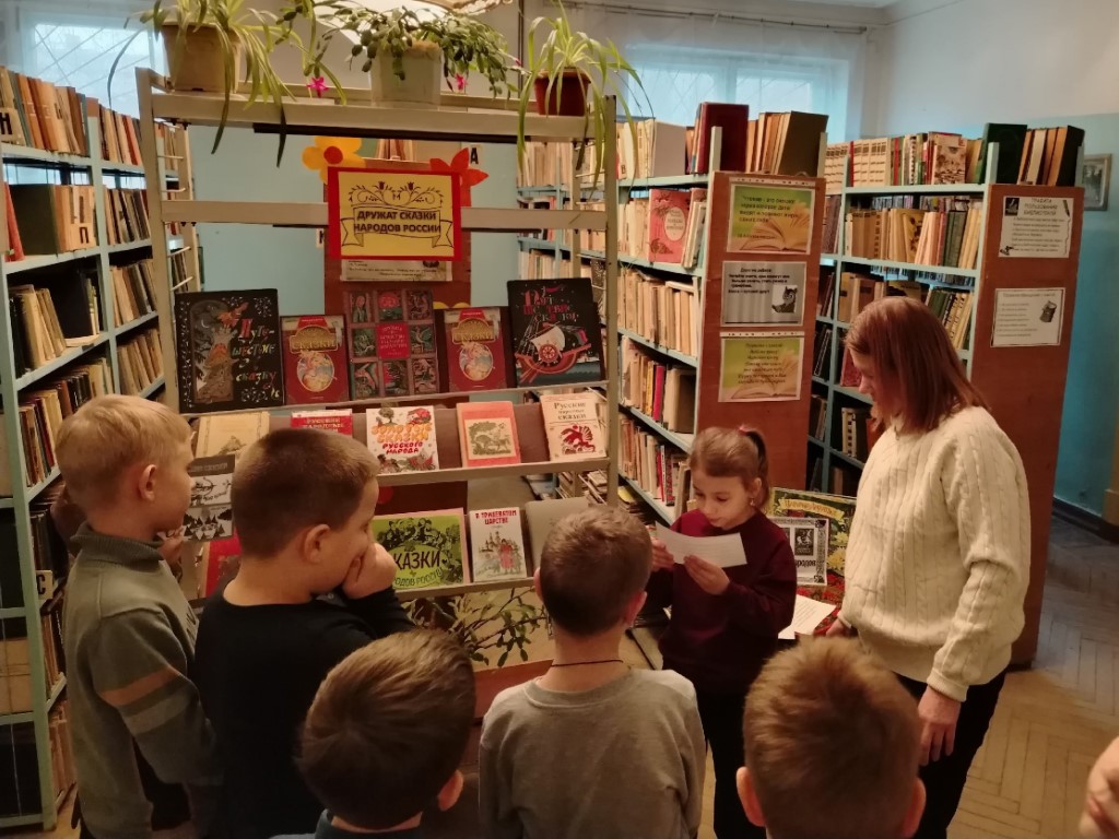 Гостей встретила библиотекарь с рассказом о том, что кроме русских в России проживают и другие народы, которые имеют свои национальные сказки.