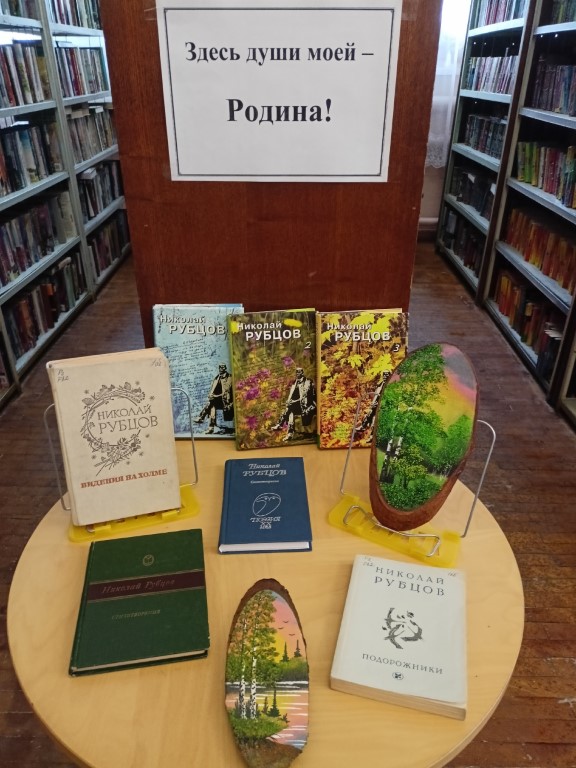 В Центральной городской библиотеке имени Л. Н. Никоновой вниманию читателей представлена выставочная экспозиция «Здесь души моей – Родина!», на которой вы сможете увидеть сборники стихотворений Николая Михайловича Рубцова, книги о его жизни и творчестве. Они рассказывают о жизненном пути Н. М. Рубцова: сиротском детстве, трудной юности, долгом пути к признанию его таланта, бесприютности и трагической гибели. Воспоминания друзей и современников поэта раскрывают его любовь к родной природе, глубокое понимание судеб всего живого, умение сочувствовать и сопереживать.