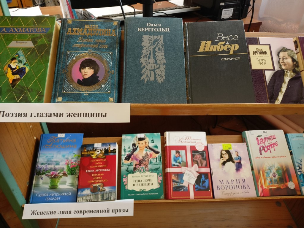 Праздничное настроение читательницам помогут создать книги современных российских писательниц: М. Метлицкой, Т. Устиновой, Е. Вильмонт, В. Токаревой, М. Вороновой, Т. Веденской, посвящённые её величеству – Женщине, а лирическую нотку внесут поэтические сборники Ю. Друниной, Т. Снежиной, Р. Казаковой, Л. Рубальской, В. Инбер, В. Тушновой, Б. Ахмадуллиной.